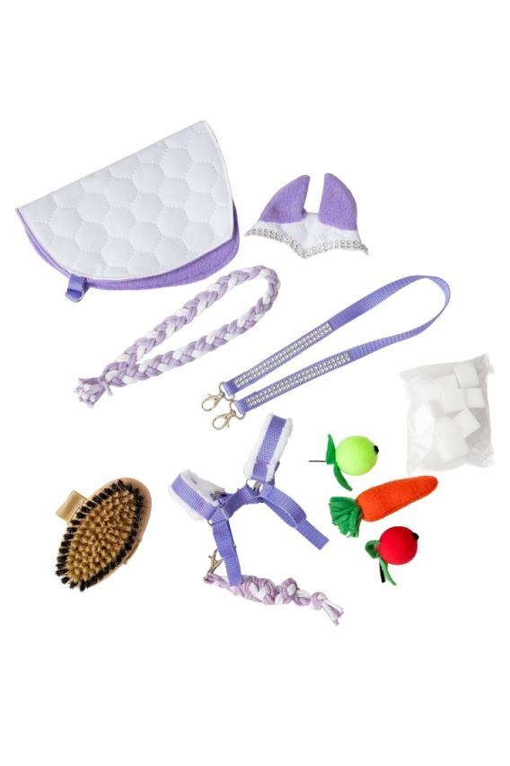 Zestaw dodatków dla hobby horsa w kolorze lilowo białym